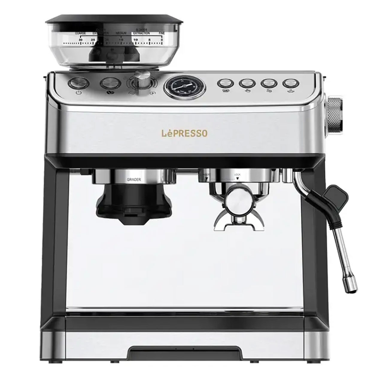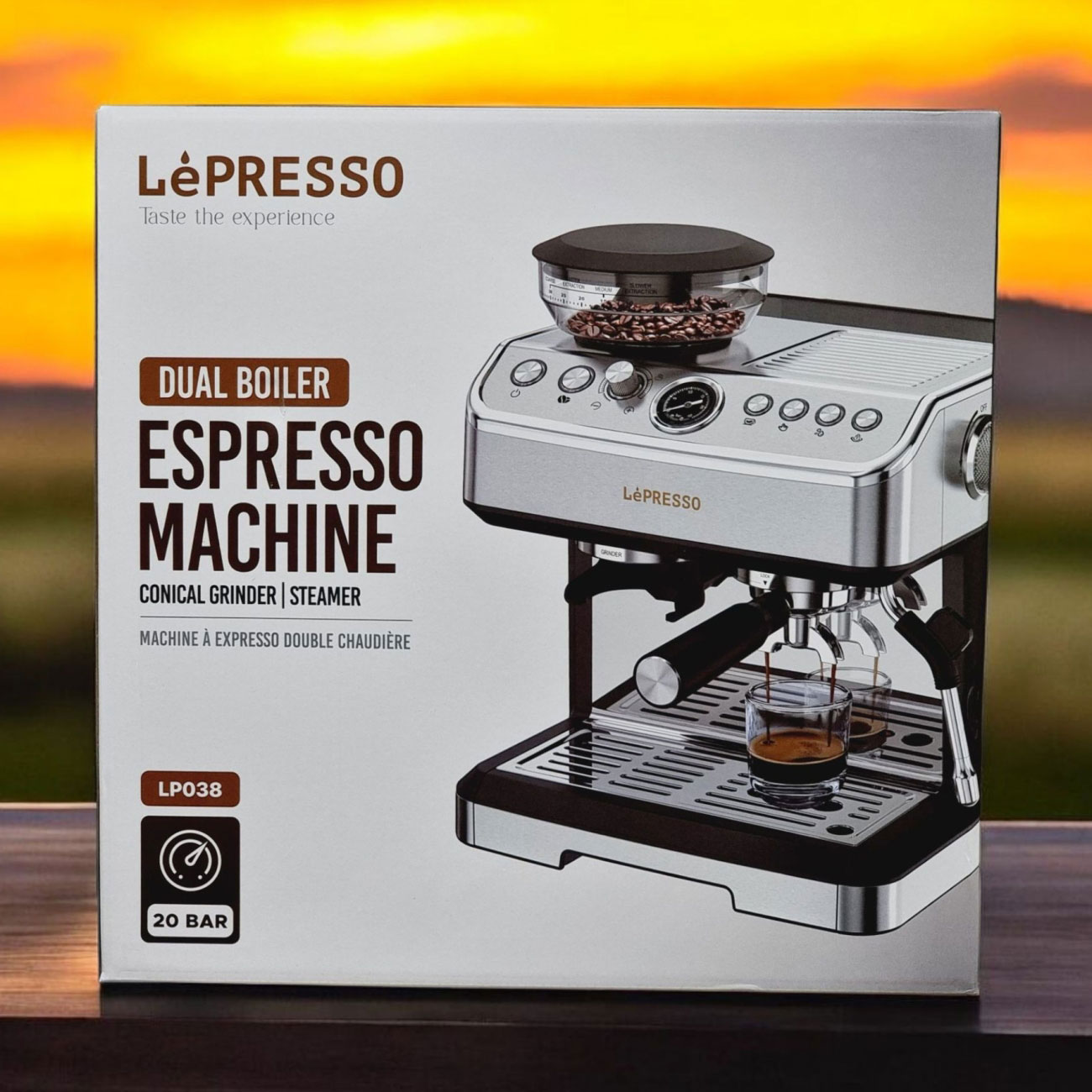 پخش عمده اسپرسوساز لپرسو دو بویلر LEPRESSO DUAL BOILER LP038 با فشار 20 بار، توان 2300 وات و مخزن 2.8 لیتری. آسیاب مخروطی 150 وات، دو بویلر همزمان، مناسب کافهها.