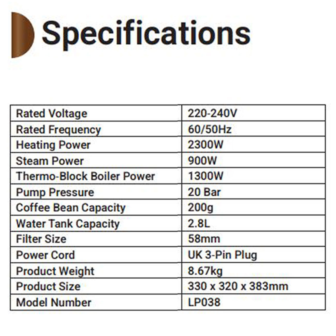 این اسپرسوساز لپرسو دو بویلر با ولتاژ 220-240 ولت و فرکانس 50/60 هرتز کار میکند. توان کل 2300 وات (1300 وات بخار + 900 وات دمآوری) و پمپ 20 بار ایتالیایی، عصارهگیری بینقص از پودر قهوه را تضمین مینماید.
